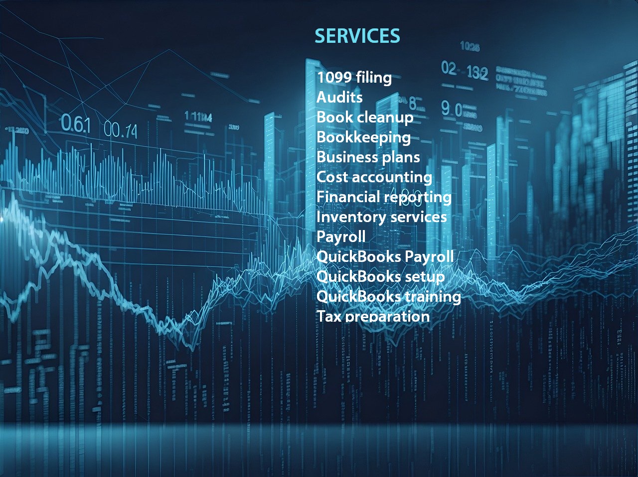 Book cleanup - 1099 filing - Business plans - Cost accounting - Financial reporting Inventory services - Payroll - QuickBooks Payroll - QuickBooks setup - QuickBooks training -Tax preparation
